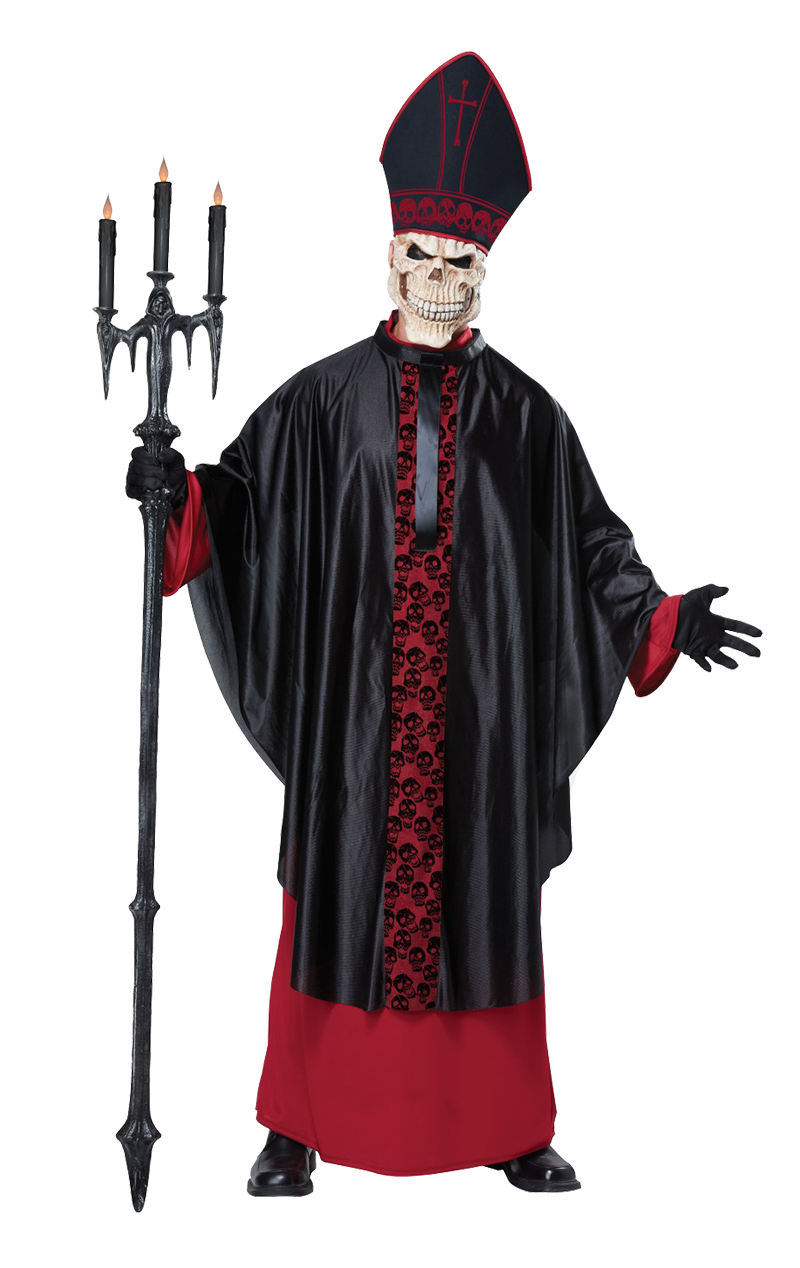 The Adult Black Mass Costume is made up of a floor-length red robe with black skull detailing, plus a black satin poncho, which ties around the neck. Completing the look is a matching black and red hat with detailing of a cross and skulls on the front, as well as a terrifying skull facepiece. You’ll have everyone praying for their sins the second they glance at you!