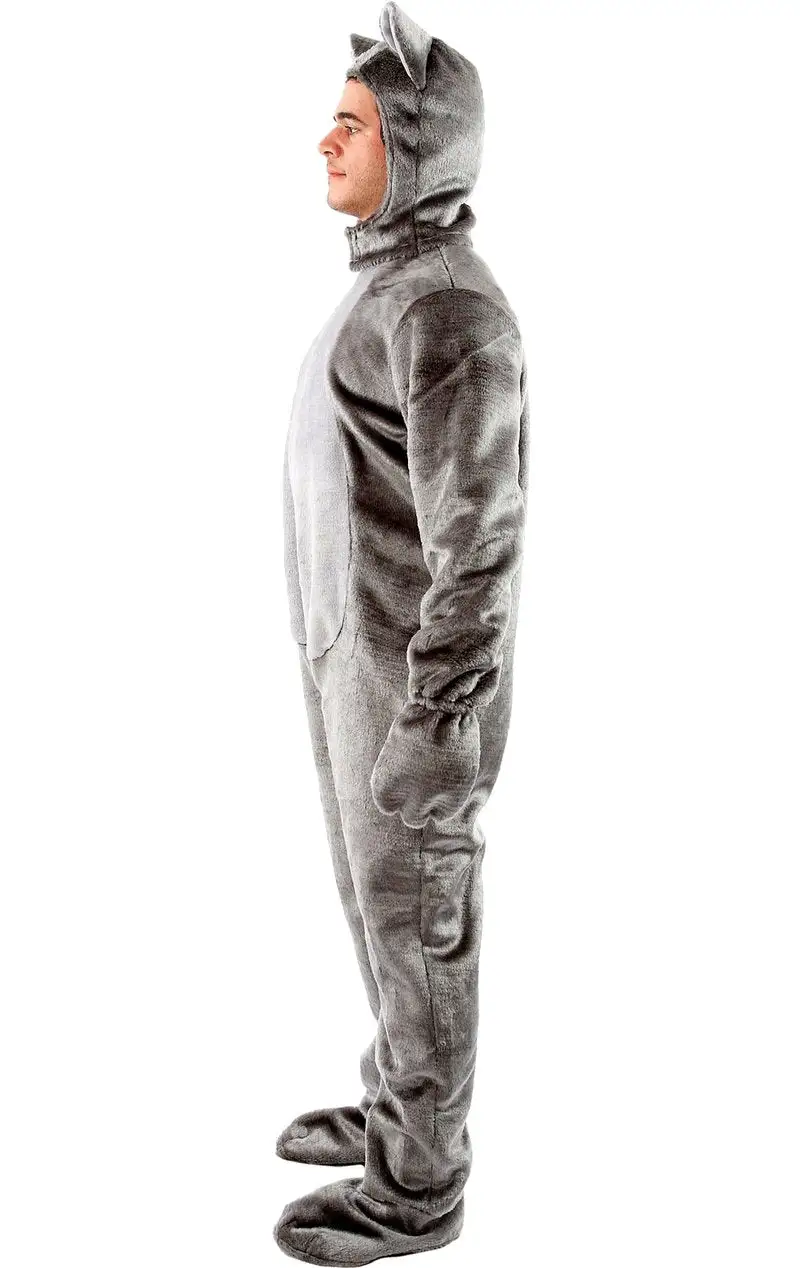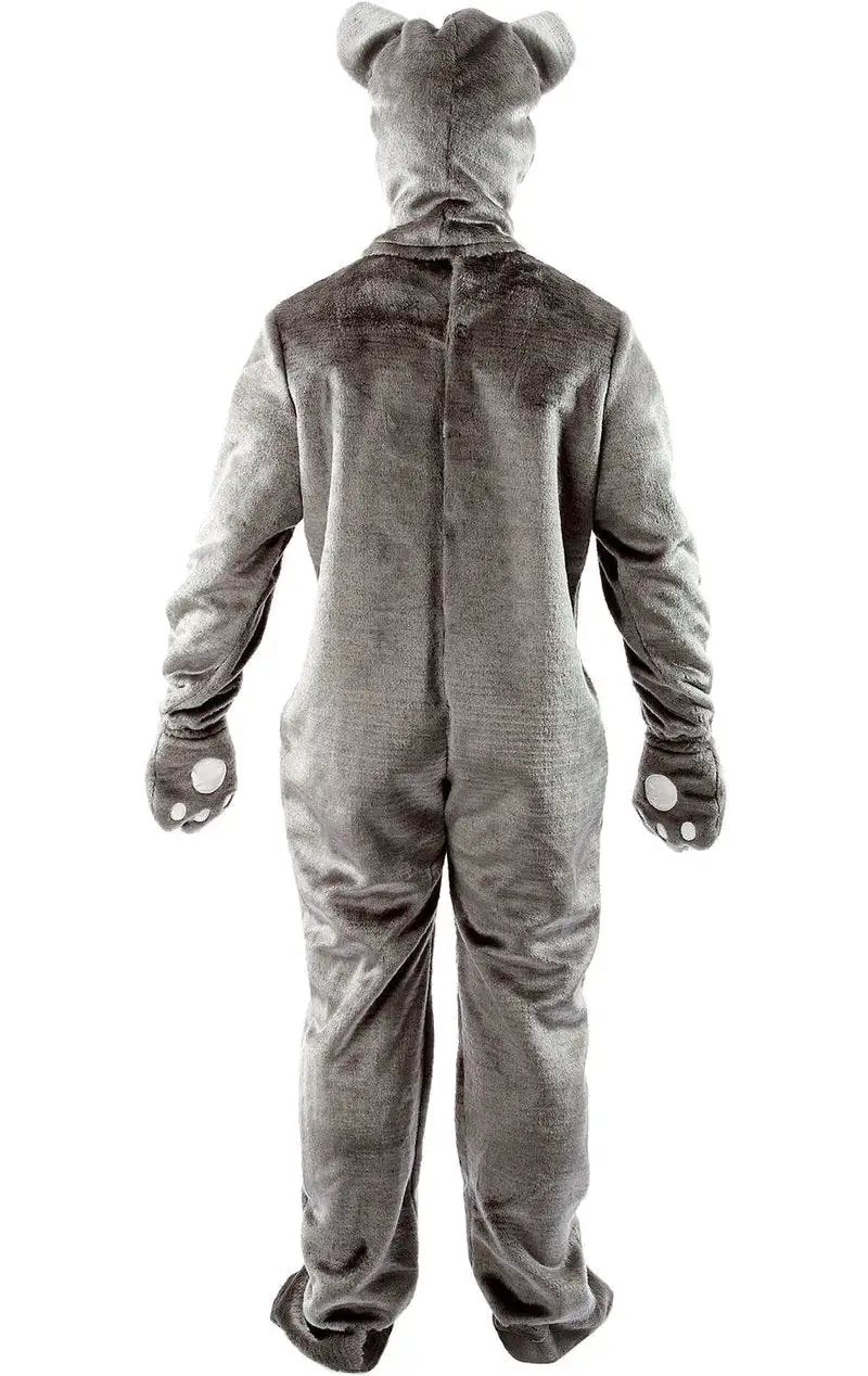 The Adult Fluffy Koala Bear Costume features a grey, fluffy all in one jumpsuit. It features attached gloves and shoe covers with paw prints on the bottom. Completing the look is a headpiece with a realistic looking cuddly Koala face on top.