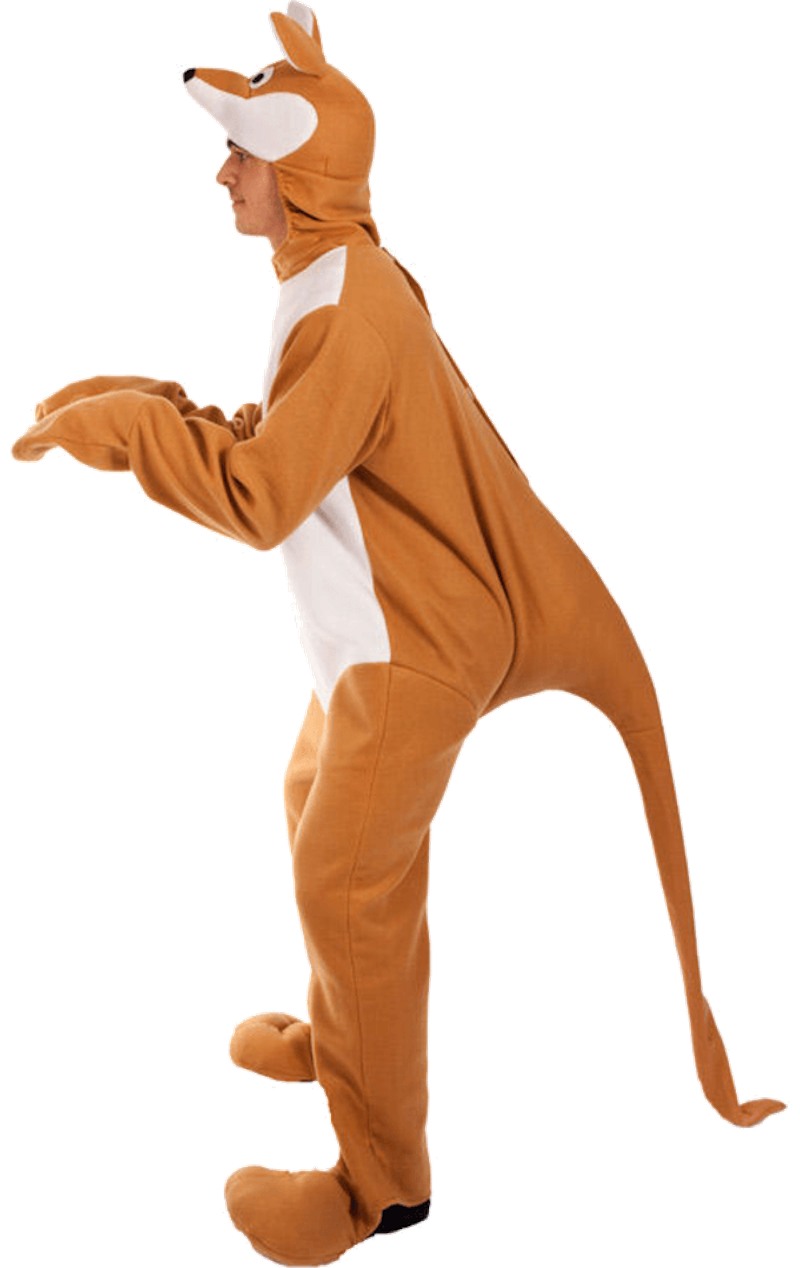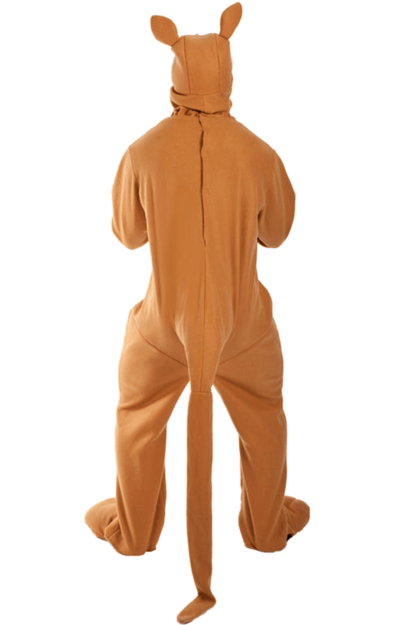 The Adult Kangaroo Costume is made up of a unisex brown and white fleece jumpsuit with a long tail attached to the back. It also includes stuffed paw shoe covers, mitten style gloves and a stuffed kangaroo headpiece that features the ears, nose and eyes of the kangaroo.