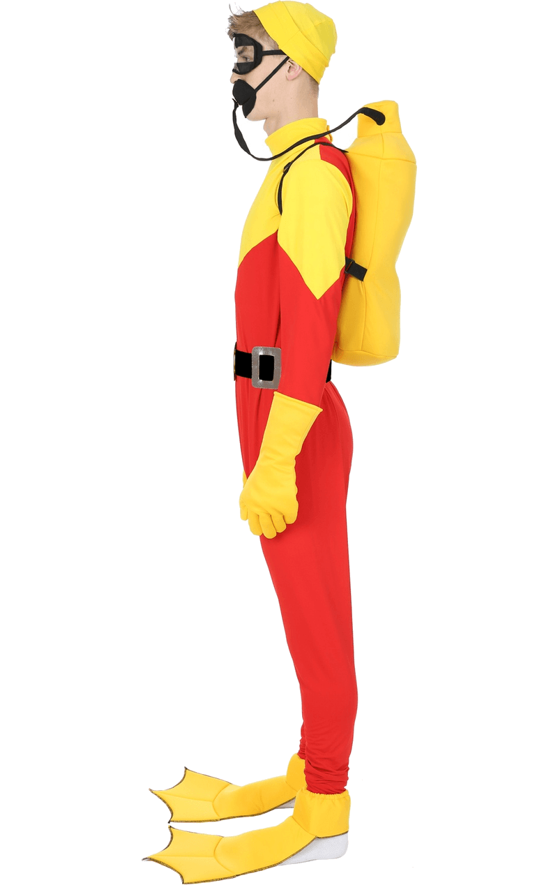 Our Adult Scuba Steve Film Costume comes complete with an all-in-one red jumpsuit with yellow detailing. It also includes a range of accessories; a yellow belt with silver detailing, a black backpack, a pair of yellow gloves, boot covers, a yellow hat, and finally, a mouth cover and eye mask. You have everything you need to dress as Scuba Steve!