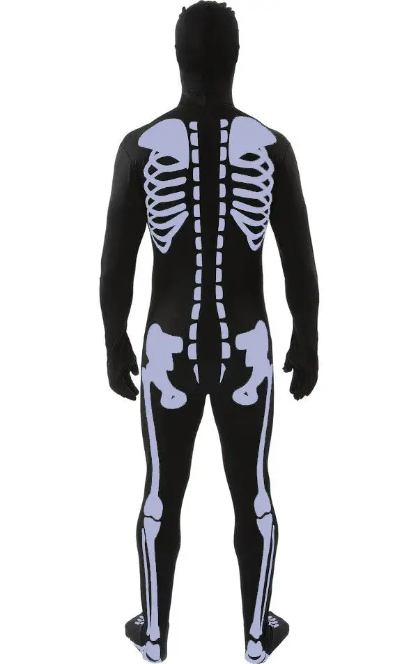 The Adult Skeleton Skinsuit Costume is unisex and is made up of a black spandex suit with skeleton bones printed on the front and back.