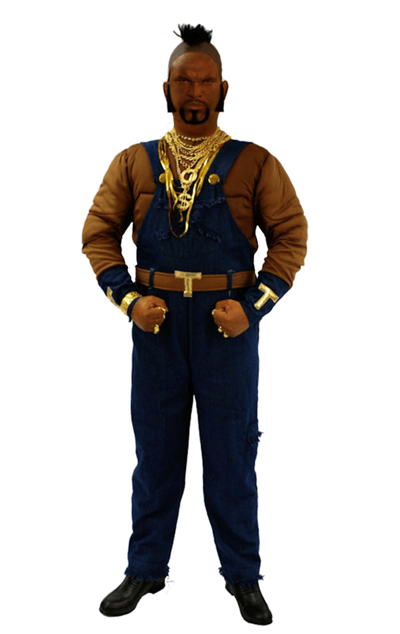 The Adult the A Team Mr T Costume is made up of brown muscle chest top so there’s no need to hit the gym hard to get in shape. It comes with all the added muscles you need to create the desired look. The costume also includes a pair of blue dungarees, a threaded gold bling necklace and the all important facepiece, which is extremely realistic. You’ll be looking just like Mr. T himself in a matter of seconds.