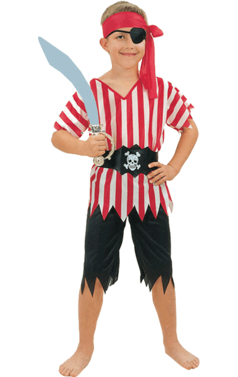 The Boys Buccaneer Pirate Costume features a striped red and white short sleeved top with ragged edges and a pair of black cropped trousers, also with ragged edges. Completing the costume is a black belt with a skull illustration on the front, plus a red bandana. If you want to spoil your child even more, add a sword, eye patch and even his very own parrot (not real, of course!).