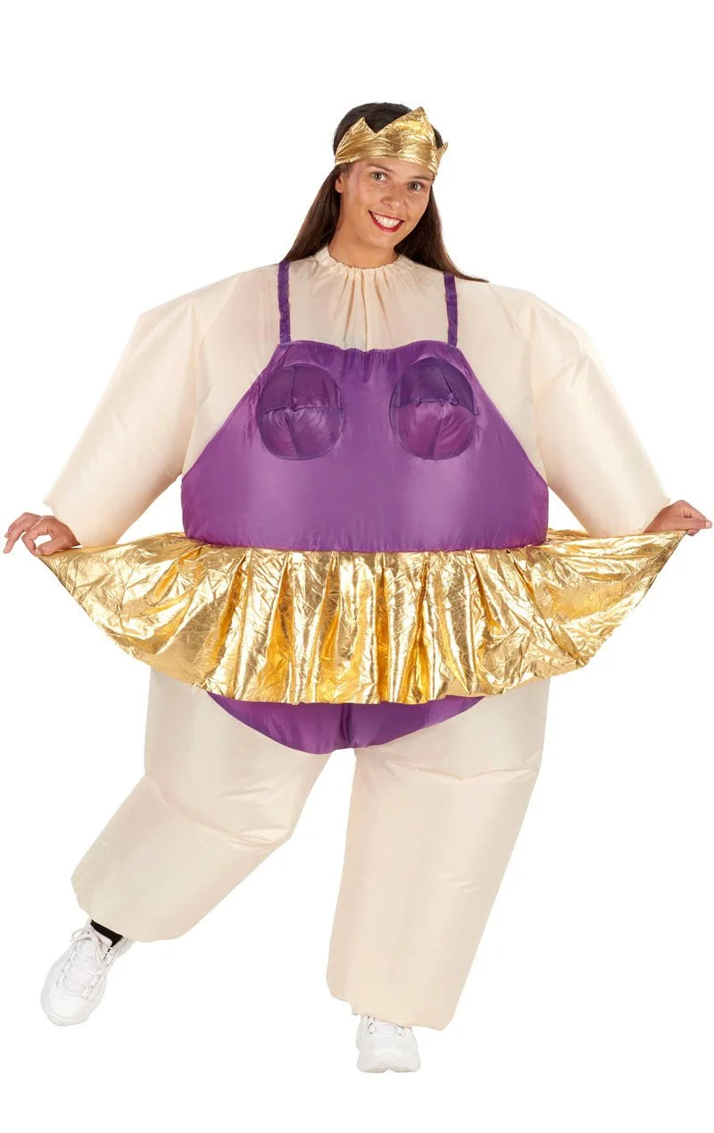 The Adult Inflatable Ballerina Costume consists of an all-in-one jumpsuit that inflates with its inbuilt pump (requires x4 AA batteries, sold separately). It features unique detailing from the dark purple one-piece, to the shiny gold tutu and a matching gold crown. This isn’t just any ballerina, it’s one with a lot of class! The costume fastens on with a back zip so it’s easy to put on and remove.