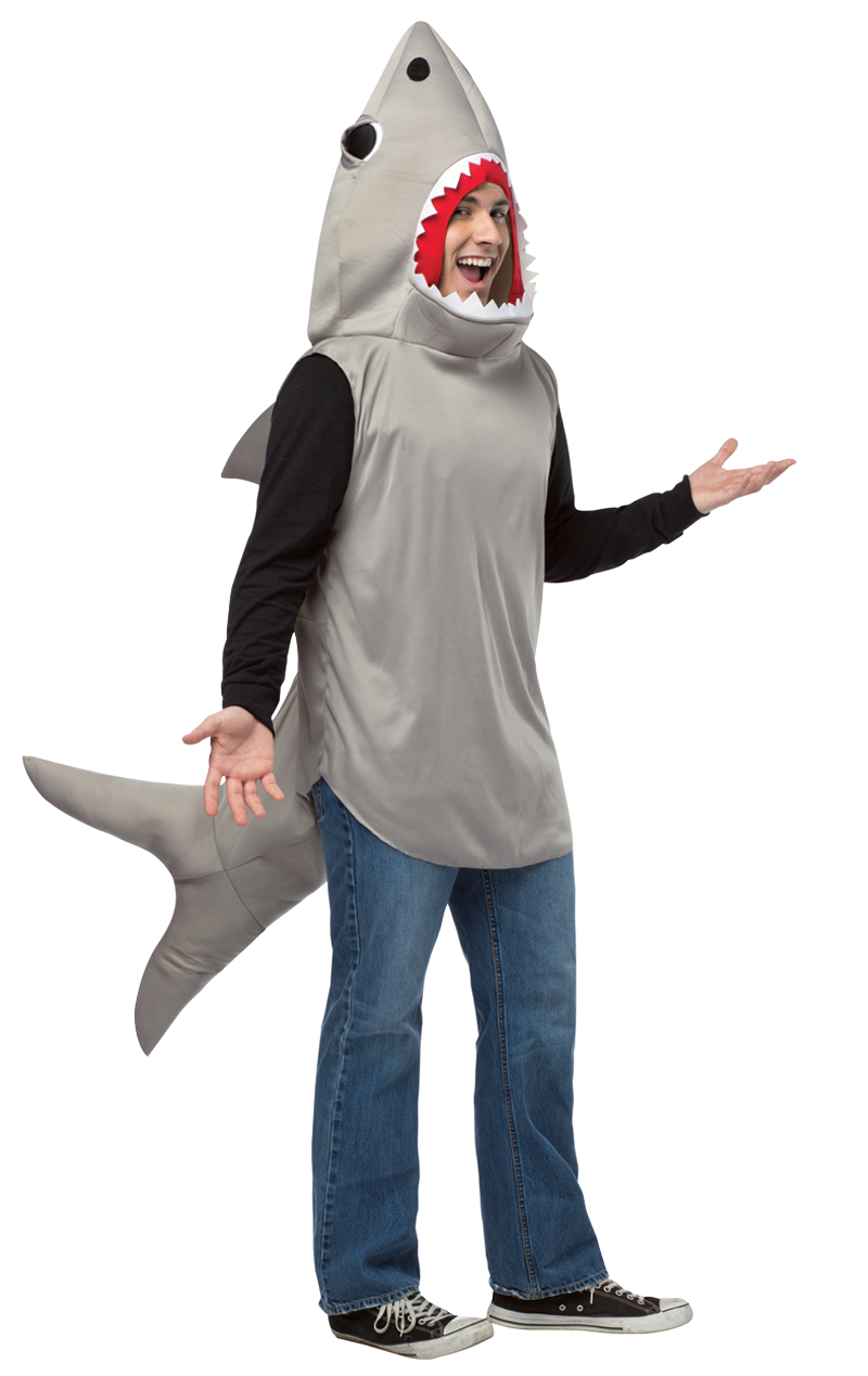 The Adult Shark Costume consists of a light grey tunic that comes in the shape of a sharp-toothed shark. The tunic fits on over the head and features a shark tail and its pointy, white teeth. Your head will poke through its mouth, so you can be sure to catch all those fish before your competition gets there first!