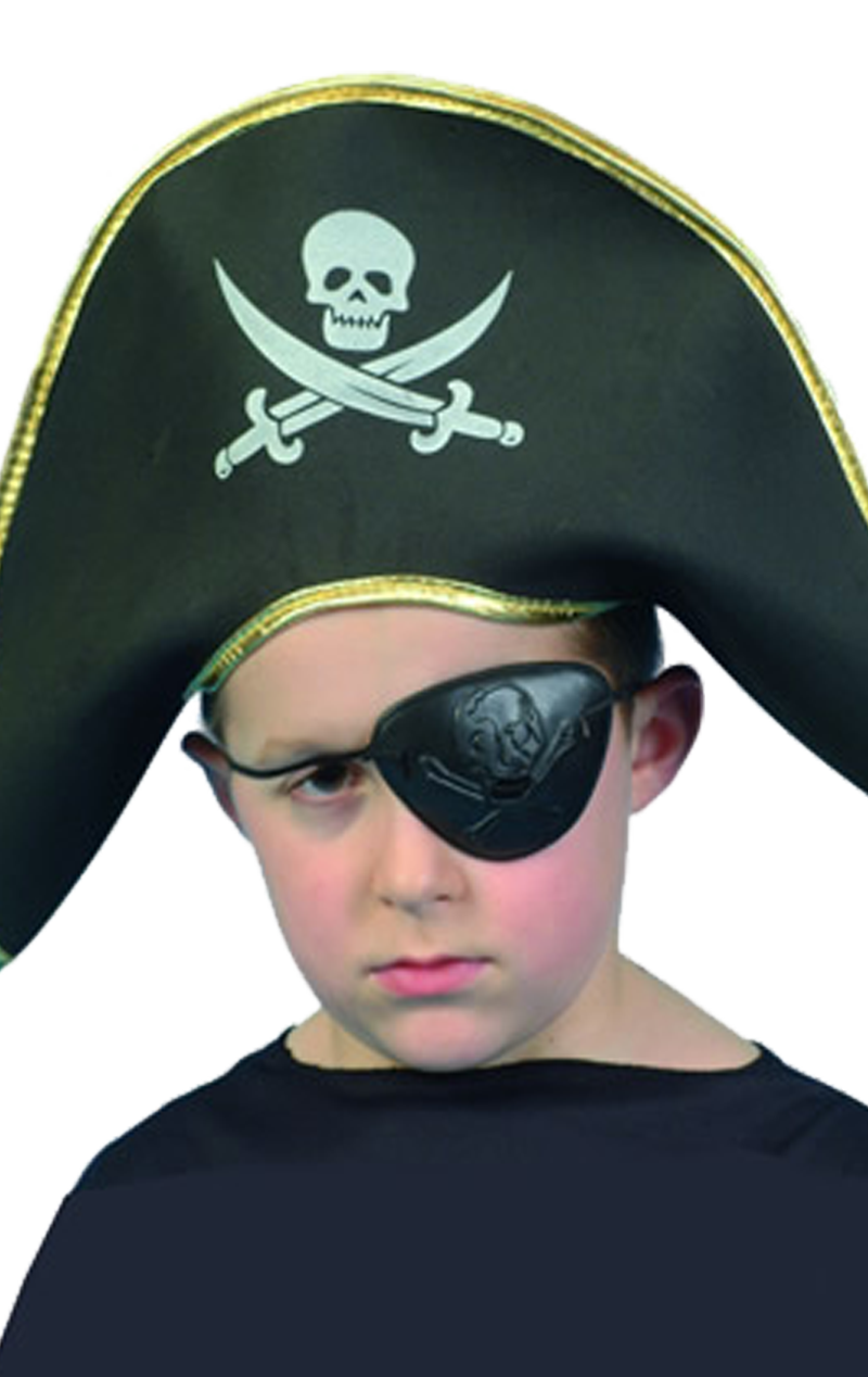Kids Pirate with imprint of skull and crossbones and gold trim around the edges. This is a one size item designed to fit most children.