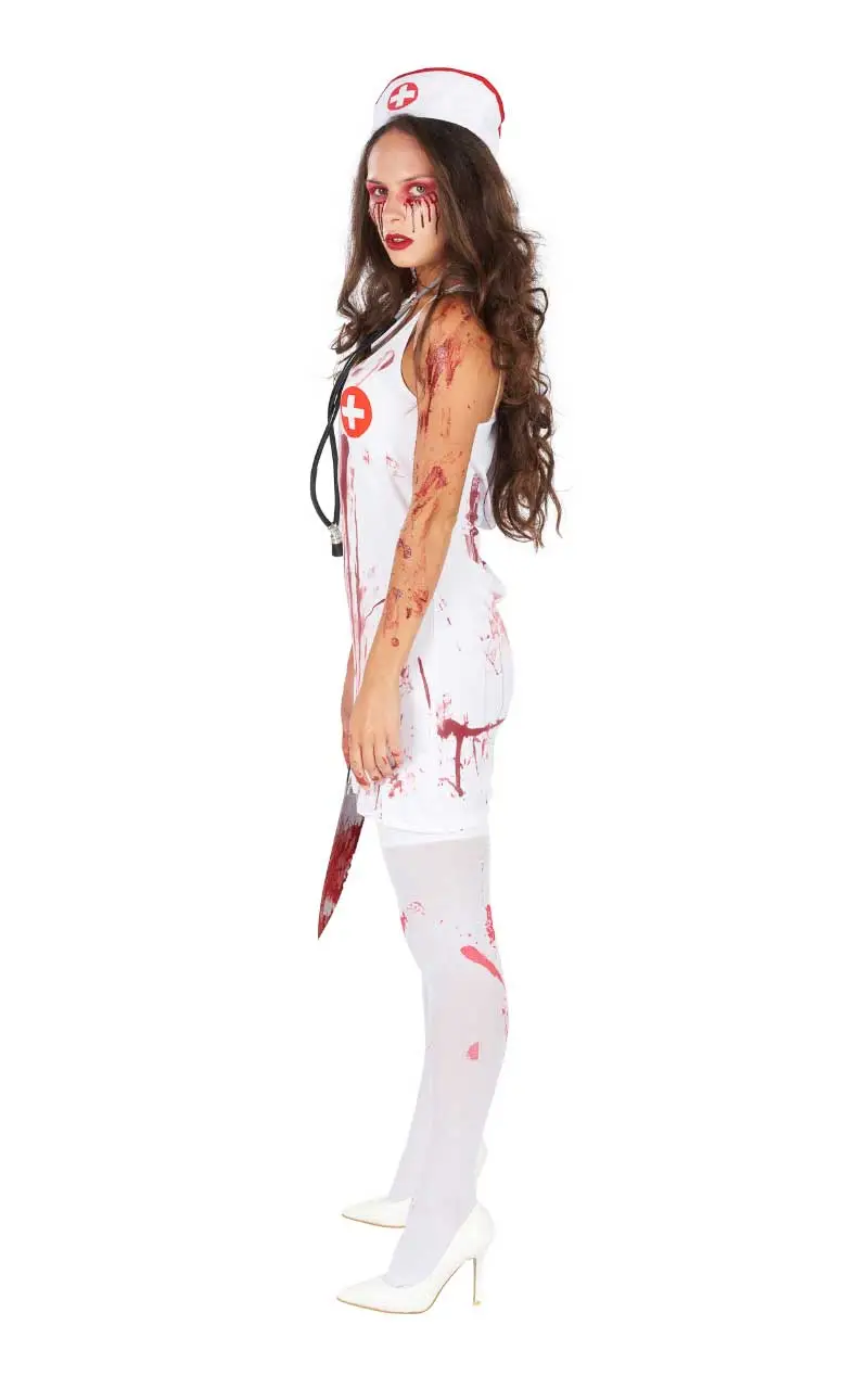 The Women’s Evil Nurse Costume comes complete with a mini white sleeveless dress, with a white and red cross logo imprinted on the top left. A tube of fake red blood is included, to give you the gory Halloween look. Smother it all over your nurse dress and go wild! To make your look ultra-sexy, why not team it up with a pair of white knee-high stockings and a white nurse’s hat, which can be purchased separately.