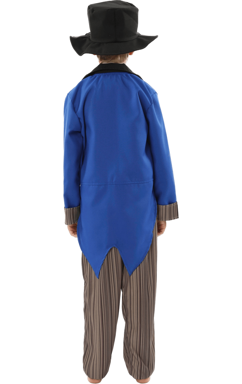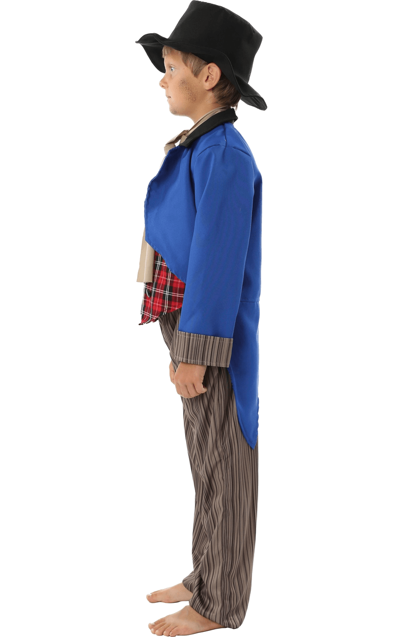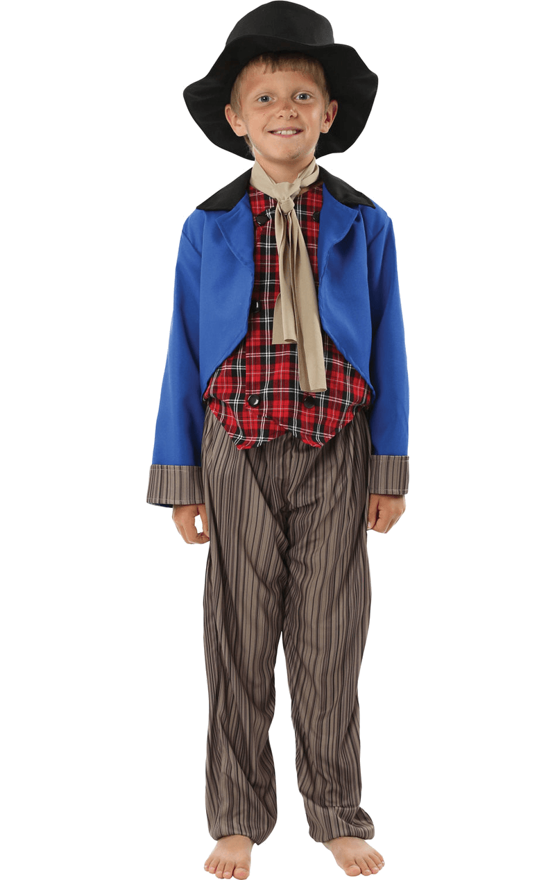 Consider yourself and your child sorted for World Book Day and any Victorian themed event in our Charles Dickens’ Oliver Twist inspired Artful Dodger costume. Let them join Fagin’s gang and get ready to Oom-Pah-Pah as they get into character for their big day. This costume features a blue jacket with attached tartan waistcoat, a beige scarf, brown striped trousers and a black hat.