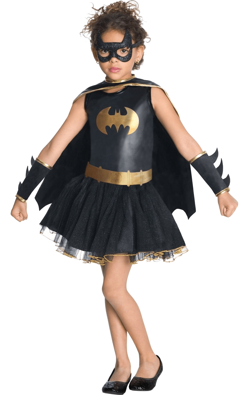 This Kids Batgirl Costume comes complete with a short sleeve black tutu dress with a gold batman logo printed on the front. Also included are a pair of boot tops, gauntlets, a gold belt, a black cape with gold rim detailing, and finally, a black eyepiece to keep her identity under wraps.