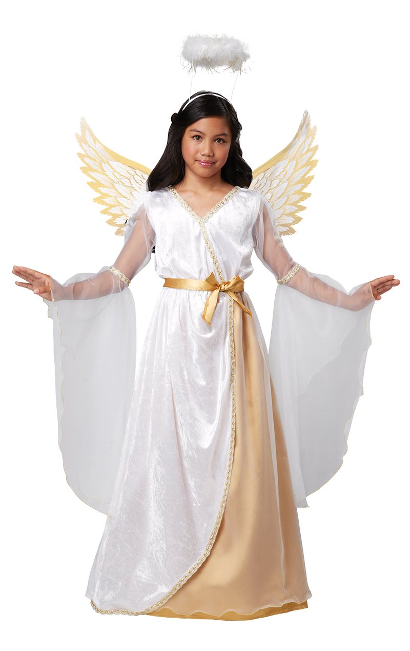 The Children’s Guardian Angel Costume is made up of white dress with gold detailing and a gold bow tied around the waist. It also includes sheer flared arms and a beautiful pair of white and gold wings. Completing the angelic look is a white faux fur halo, which gives it a classic and elegant finish.