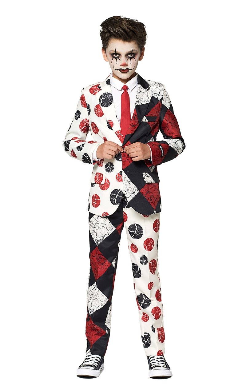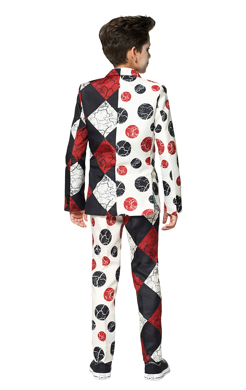 The Kids Halloween Vintage Clown Costume is made up of a cool, multi-patterned suit jacket and trousers, in red, white, and black. They also feature fun polka dots and a harlequin print. Completing the costume is a red tie so he can look insanely dapper.