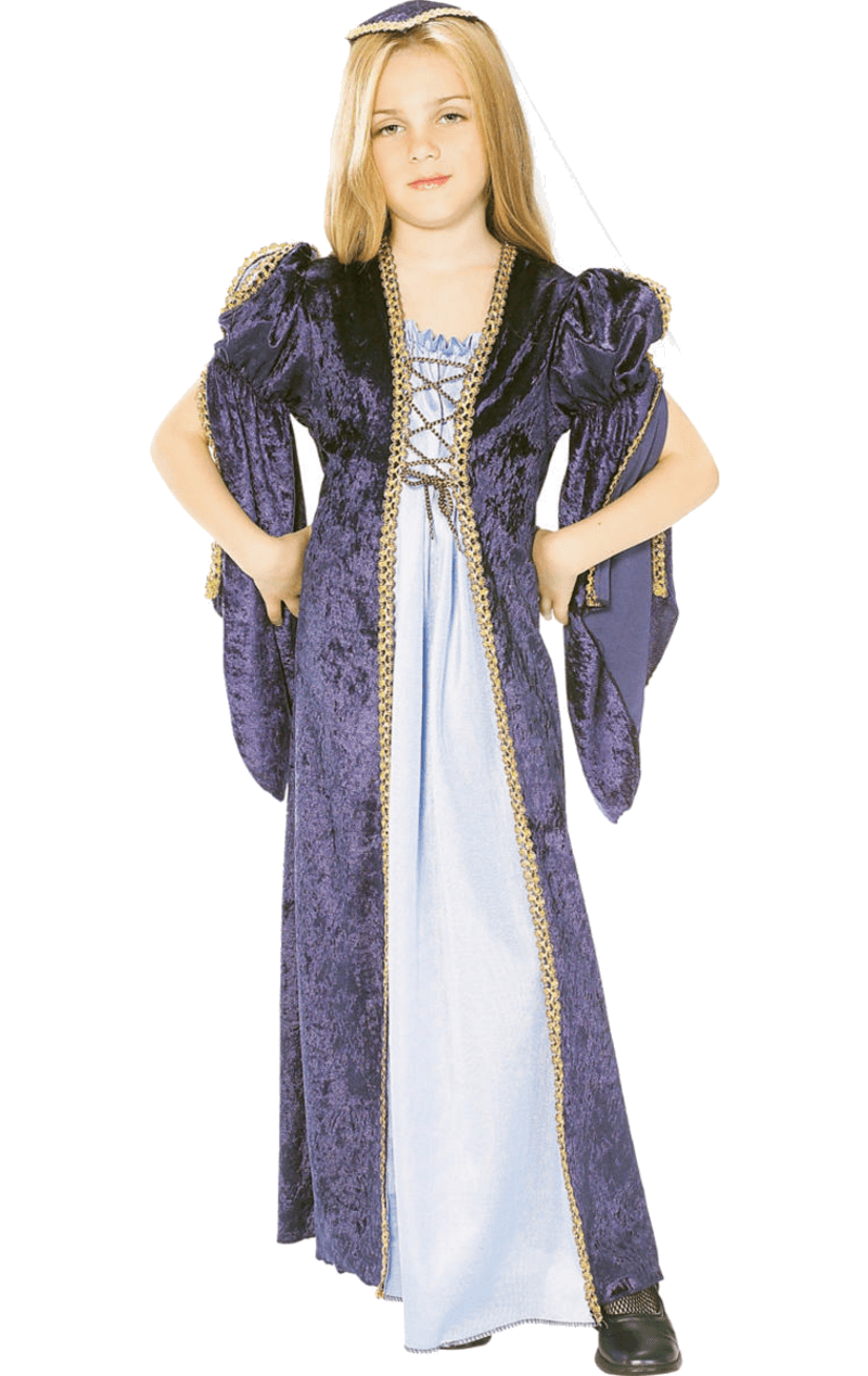 Our Kids Juliet Costume consists of a long floor-length lilac dress. The dress is a mixture of dark purple colours, with a lighter shade in the middle. It also features stunning gold detailing. Completing the look of this iconic Shakespeare character is a purple headpiece.