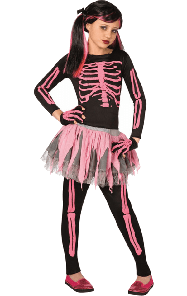Our Kids Pink Skeleton Tutu Costume comes complete with a long-sleeved black top with pink skeleton bone detailing on the front of the arms and chest. Also included are a pair of matching black trousers with a pink tutu skirt, which fits on over the top. All girls love a good accessory, and luckily for her, our pair of matching pink gloves are also included.