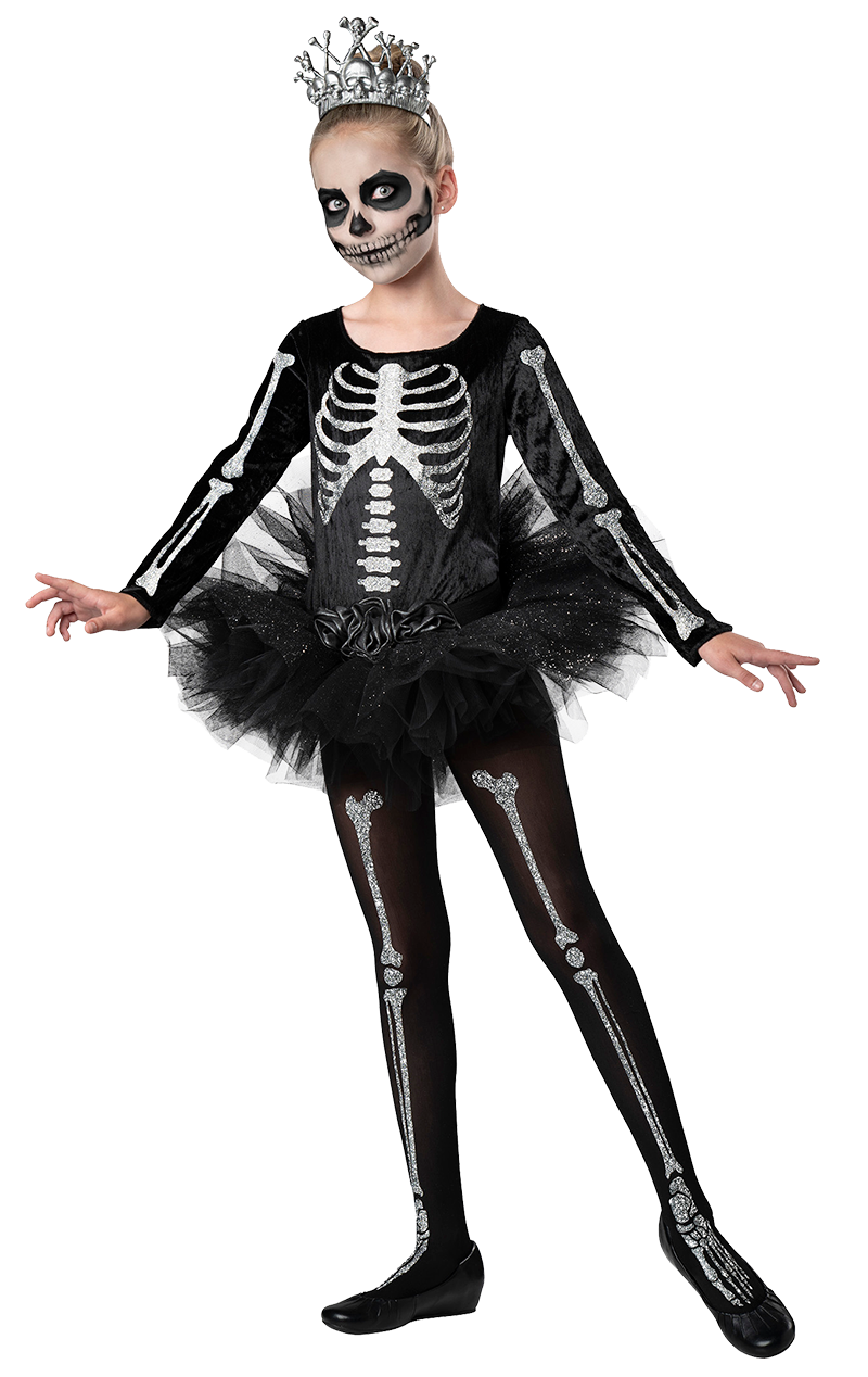 This Halloween your child will spin into the party in this beautiful and glittery Kids Skelly Ballerina Costume. Perfect for trick-or-treating, this outfit features a velvet feel long-sleeved leotard and a black glitter tutu. This girls skeleton costume feature a glittered bone design, as well as a skull and bones silver crown, making sure your little one looks like royalty and she pirouettes around the party!