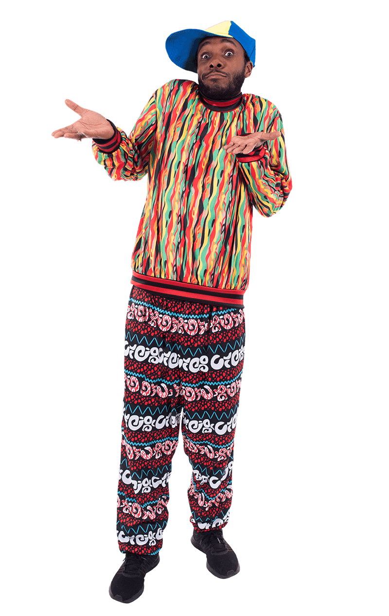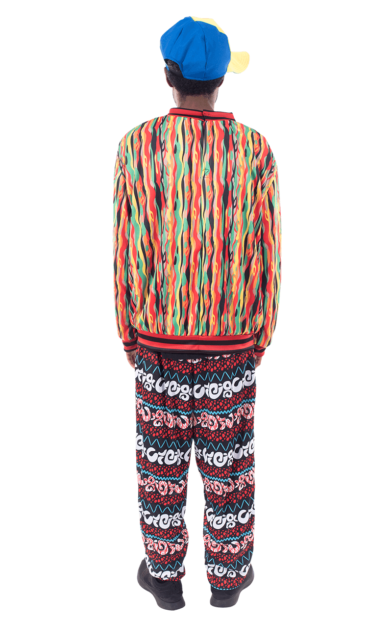 The Men’s 90s Freshest Prince Costume is made up of a bold and vibrant long sleeved top, featuring rainbow colours and red and black detailing around the collar, sleeves, and hem. The costume also includes a pair of equally colourful trousers with a variety of unique prints. Completing the look is a blue and yellow cap, giving you everything you need to ‘get up to no good in the neighbourhood’.