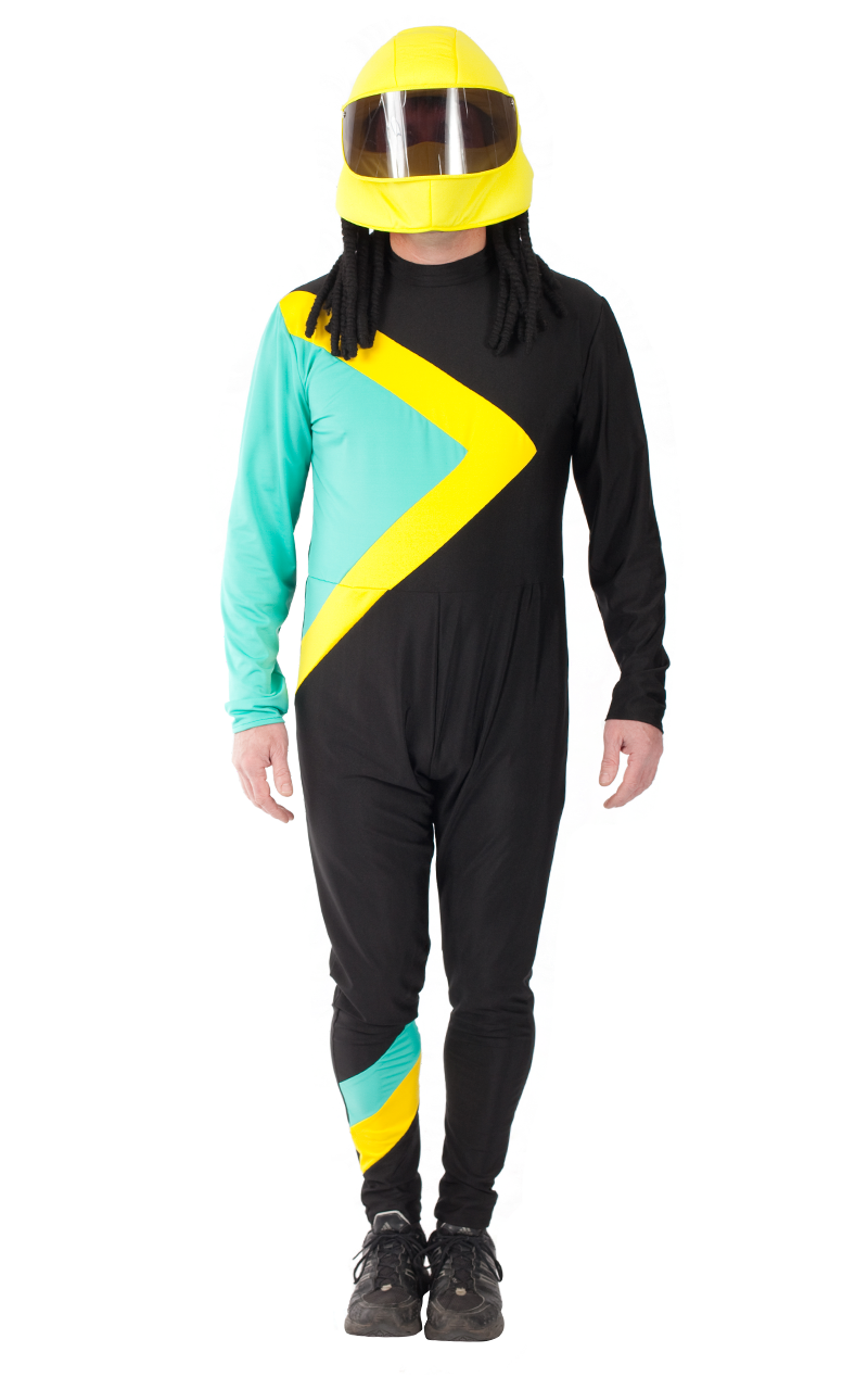 The Mens Cool Runnings Costume with Helmet is made up of an all-in-one jumpsuit that’s printed with the colours of the Jamaican flag; black, yellow and green. To complete your sports hero look is a helmet with attached hair.
