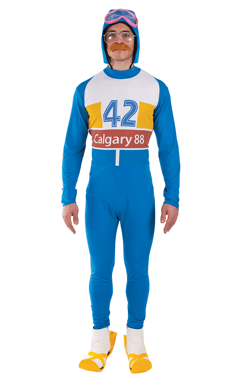 The Men’s Eddie the Eagle Costume is based on his Calgary 88 uniform, which is printed on the front of the jumpsuit, and includes a matching blue helmet. To complete your Eddie the Eagle look is a pair of yellow skis and big framed dorky glasses that will have you looking like the Olympian himself.