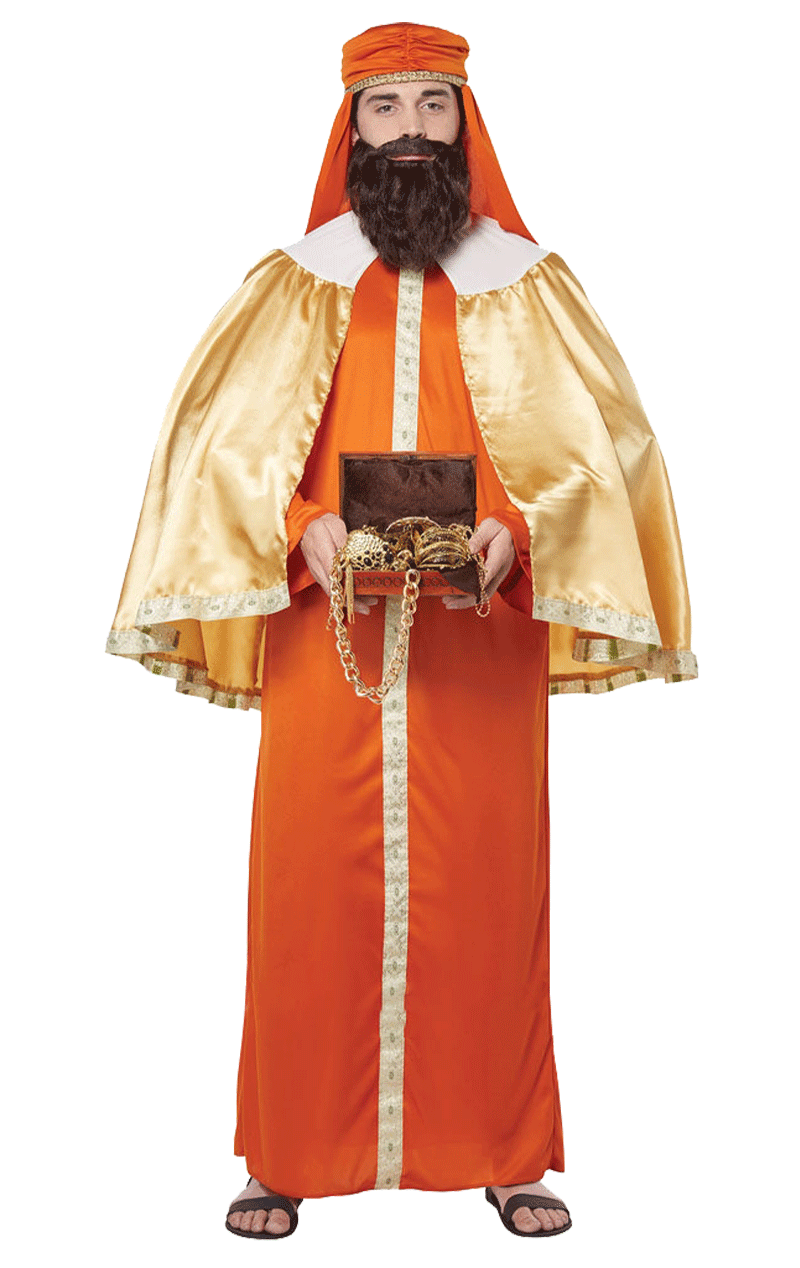 The Men’s Gaspar Three Wise Men Costume is made up of an orange robe that’s trimmed with gold. It features a matching turban, as well as a gold cape with intricate detailing. You’ll look the part, all ready for your trip to Bethlehem.