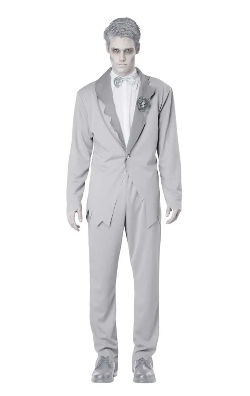 The Men’s Ghostly Groom Costume is made up of a pale grey suit jacket with smart buttons in the centre. It also features darker grey lapels with a jagged edging and a pair of matching elasticated smart trousers. Completing the look is a white shirt and a light grey satin bow tie, which fastens with Velcro. Why not add some pale makeup to finish off that deadly appearance.