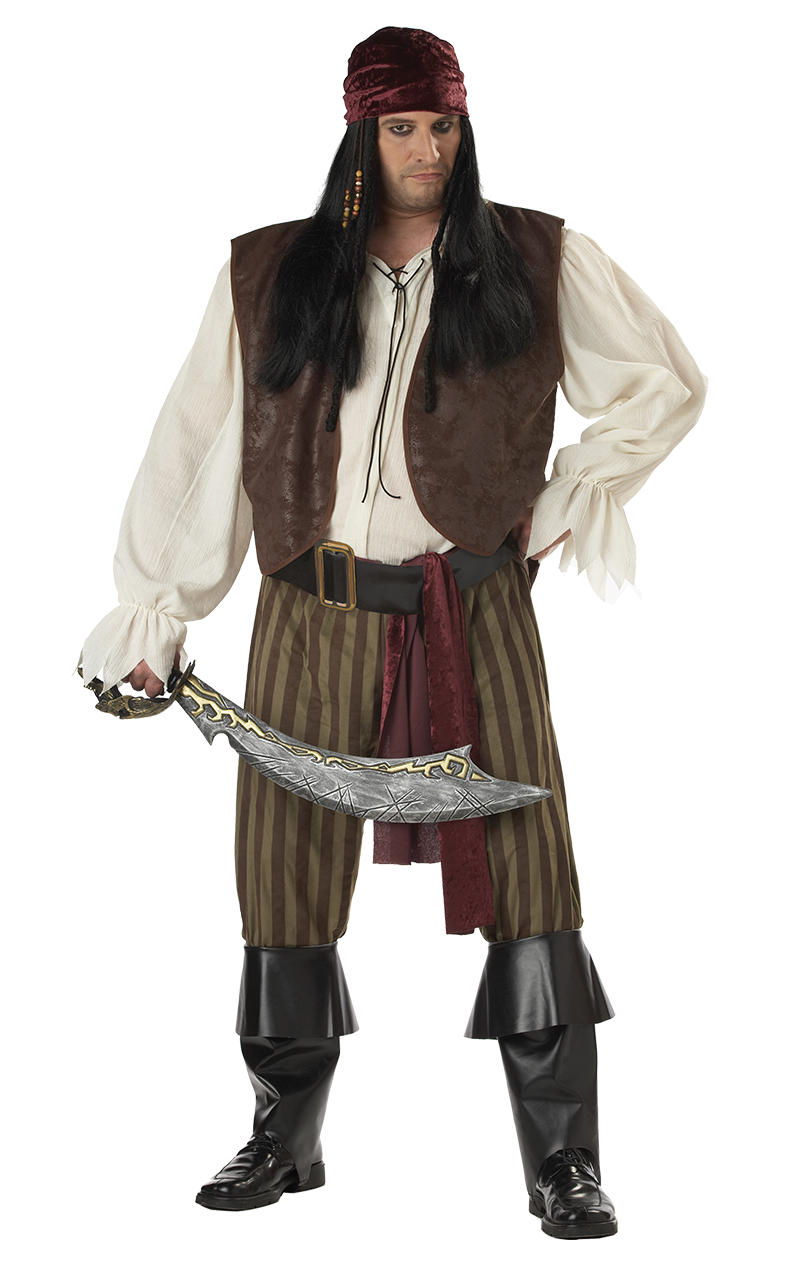 The Mens Plus Size Rogue Pirate Costume comes complete with a long sleeve, cream coloured shirt with frayed sleeves, and a dark brown sleeveless waistcoat over the top. Also included are a pair of brown striped trousers to complete the look. No pirate would be a true pirate without a pair of leather-style black boot covers and a red velvet-style bandana. You have everything you need for a night of seafaring fun and getting up to no good!