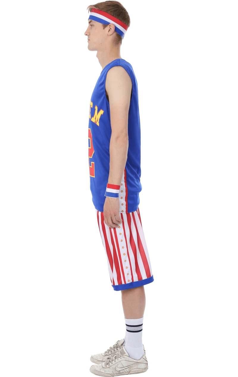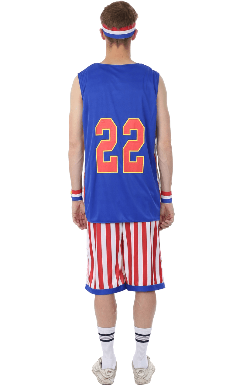 The USA Harlem Globetrotters Costume is made up of a bright blue tank top with the words ‘Harlem 22’ printed on the front, in bold yellow and orange text. The costume also includes a pair of striped red and white shorts, a pair of red, blue, and white wristbands, and a matching headband in the same design to keep you cool during the game.