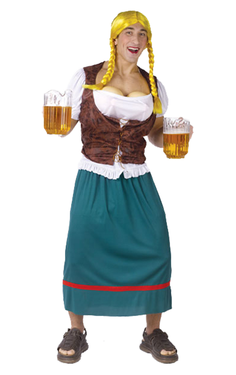 Anyone fancy a drink? With the Miss Oktoberbreast costume you’ll be the most popular person at Oktoberfest, as not only will you look hilarious, but you’ll be carrying around a moving bar in your ample chest! Your beer tap breasts really work when pouring drinks for your friends! This side-splitting fancy dress, drag costume will have you dressed as a Bavarian Maid, and even has traditional blonde plaited wig to go with your new boobs.