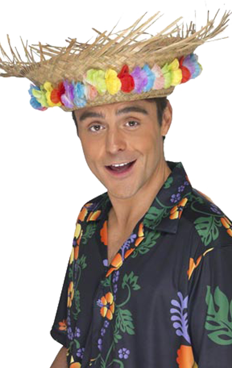 Aloah, this is the perfect hat for a Luau, woven out of straw the unfinished ends stick out all around the brim. The hat is finished off with leis style flowers.