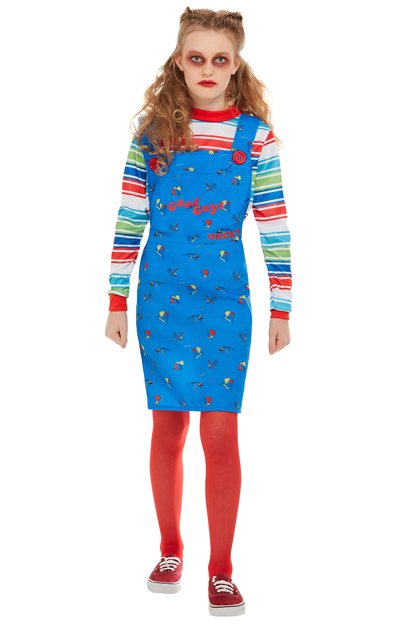The Kids Chucky Dress Costume includes a vibrant blue, patterned, dungaree-style dress, with ‘Chucky’ and Good Guy’ printed on the front in red. The costume also features a multicoloured striped T-Shirt. Just add some creepy doll makeup or a mask and she’ll be good to go.