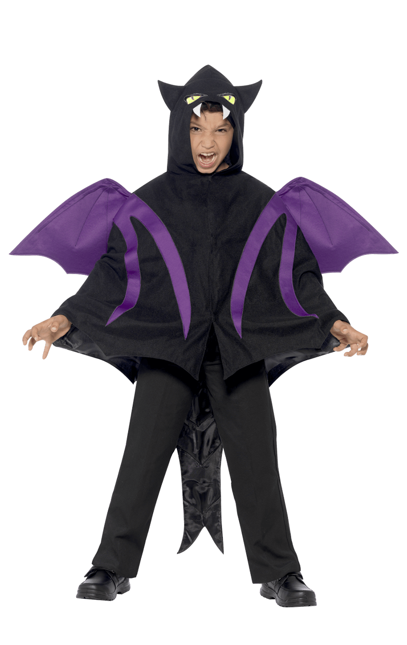 The Kids Hooded Bat Cape Costume includes a black hooded cape with attached purple bat wings. The face of the bat is printed on the front of the hood, with bright yellow eyes and fangs. The cape also has the long black tail attached to the back, completing the look for an outfit they’ll love.