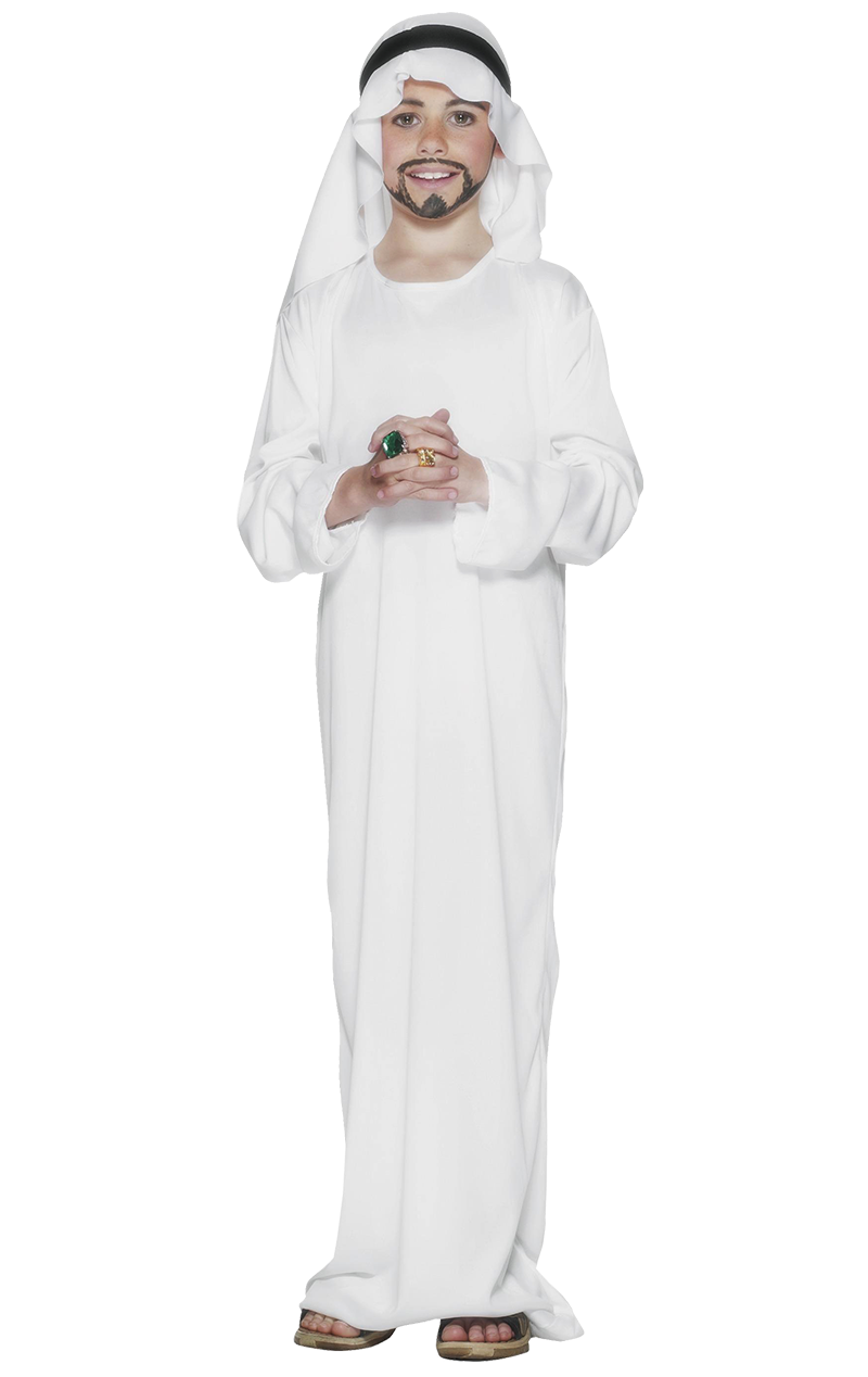 The Kids Nativity Innkeeper Costume is unisex and is made up of a long white robe with matching headdress, which ties with a black ribbon for a comfortable and secure fit.