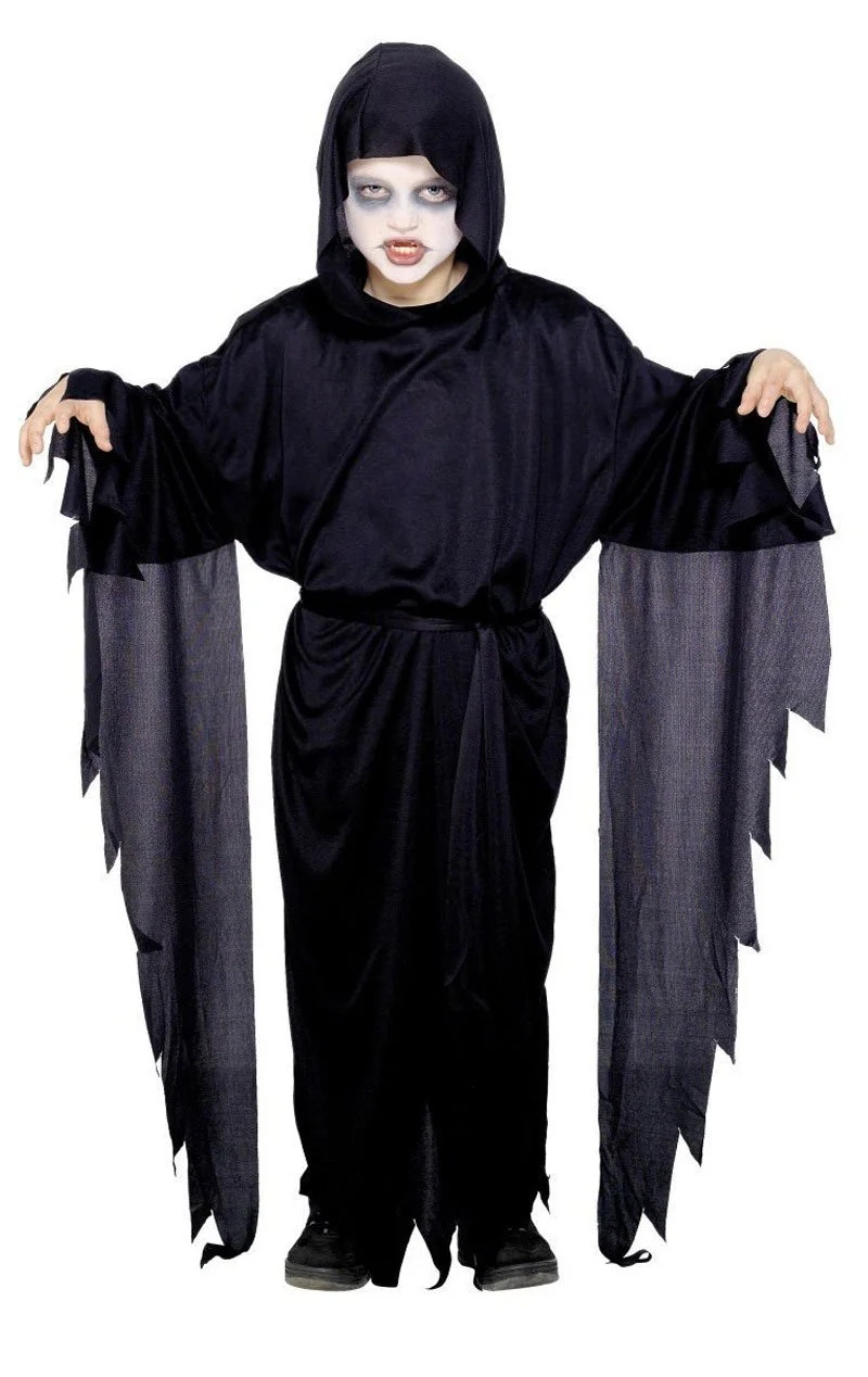 The Kids Screaming Ghost Robe includes a black, all-in-one floor length robe with long jagged sleeves and a black hood that creates that signature screamer look. The costume also features a black belt to secure the robe in place for a comfortable fit. Just add some frightening Halloween face paint and they’re ready to cause chaos.