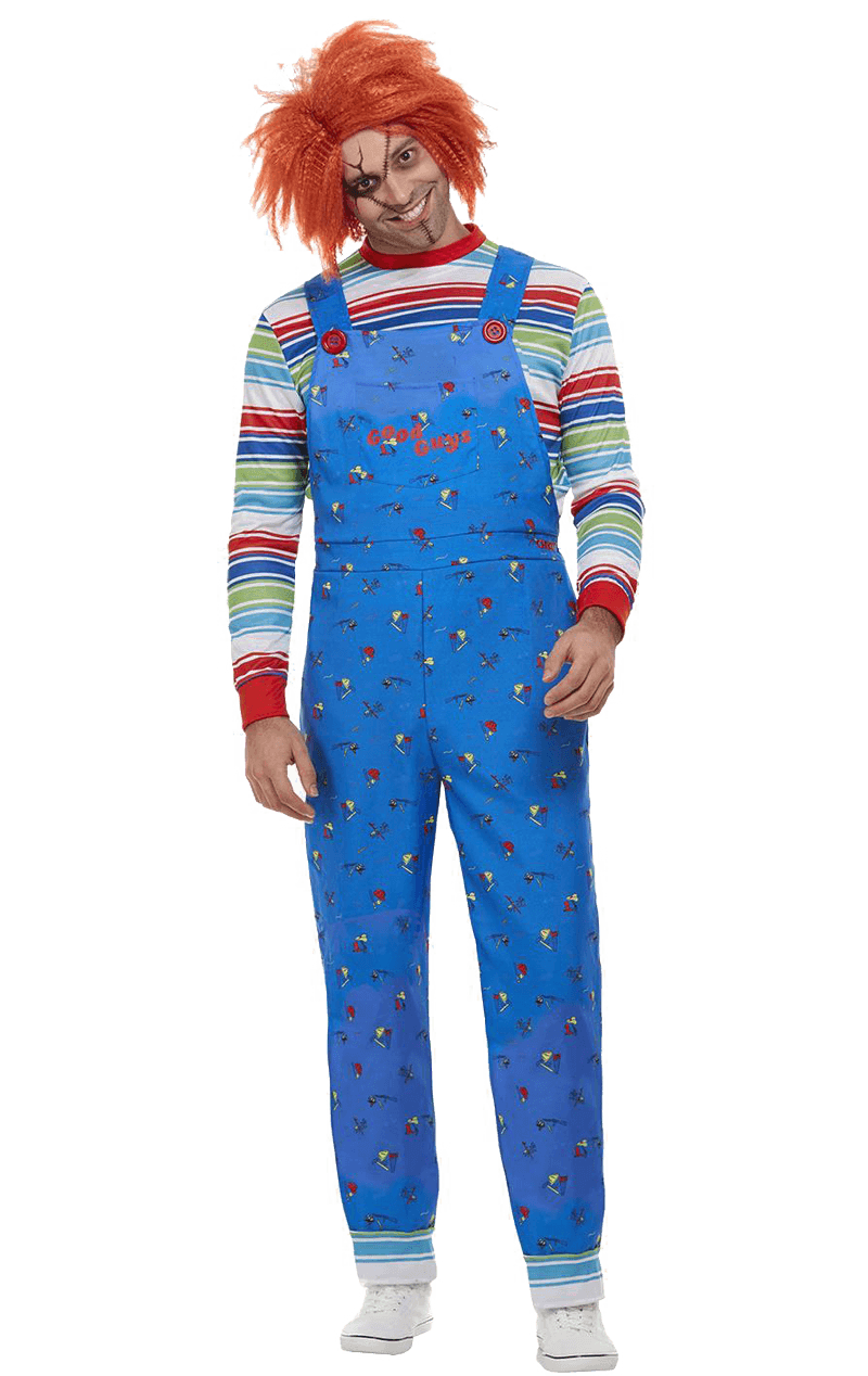 Become the bad-mouth killer doll that’s been possessed by the voodoo spirit of a serial killer this Halloween. The Mens Chucky Halloween Costume features the iconic blue ‘Good Guys’ dungarees and striped top so that you can look like you’ve jumped straight out of the Child’s Play movies. Ideal for Halloween, this horror=tastic mens Chucky costume just needs a weapon, some facial scars and a crazy wig to be completed. Get ready to spook trick-or-treaters with this horrifying doll costume!