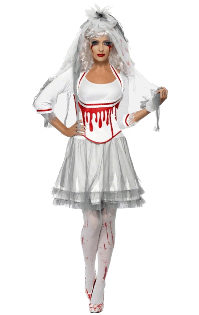 The Womens Halloween Bleeding Bride Costume is made up of a white dress with a grey gauze and lace detailing over the skirt. The costume also includes a corset style top with red blood drip stains down the front to add a gory feel to the look. Just add more fake blood and a creepy veil to give yourself the ultimate bleeding bride appearance.