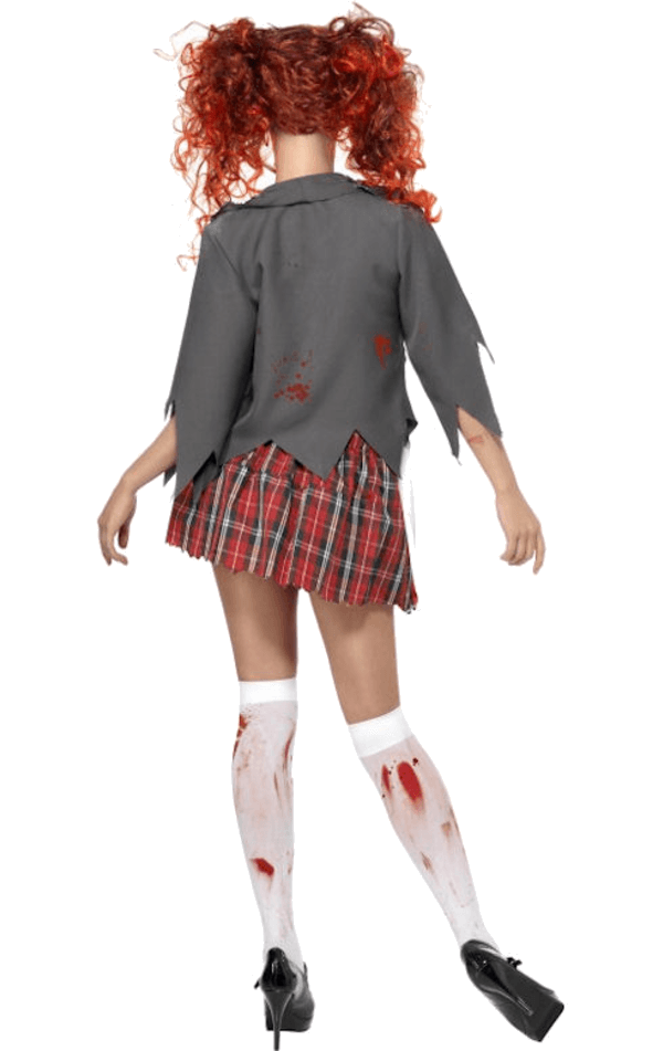 The Womens Zombie School Girl Costume is made up of a short, red tartan skirt, featuring a jagged hemline and a matching black school tie with the same jagged edging. The costume also includes a tattered grey jacket with an attached white school blouse, which is covered in printed blood splatters. Add some zombified makeup and a wacky hairstyle to complete your deadly schoolgirl look.