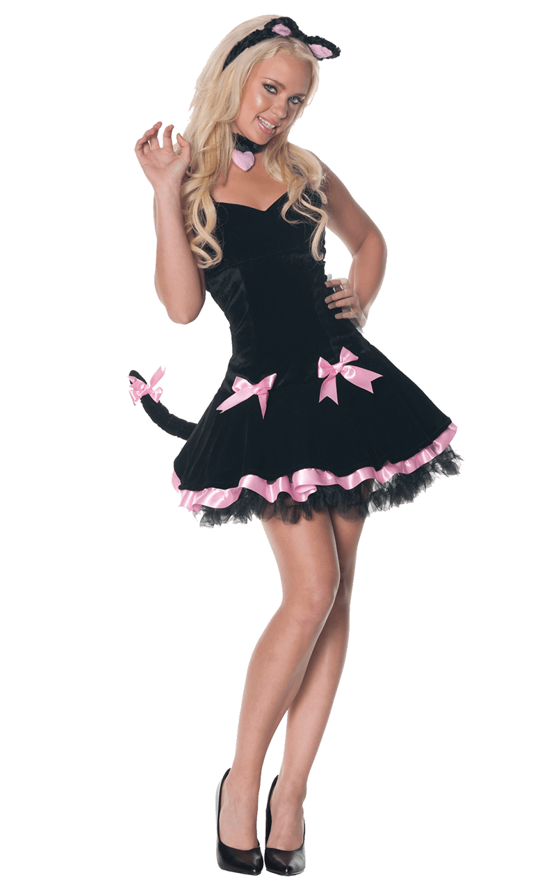 Our Women’s Frisky Cat Costume comes complete with a mini black tutu-style dress. It features stunning pink ribbon detailing and two bows on the skirt. No cat would be complete without a set of cute ears with pink lining, and of course, their tail, which has a mini pink bow on the end.